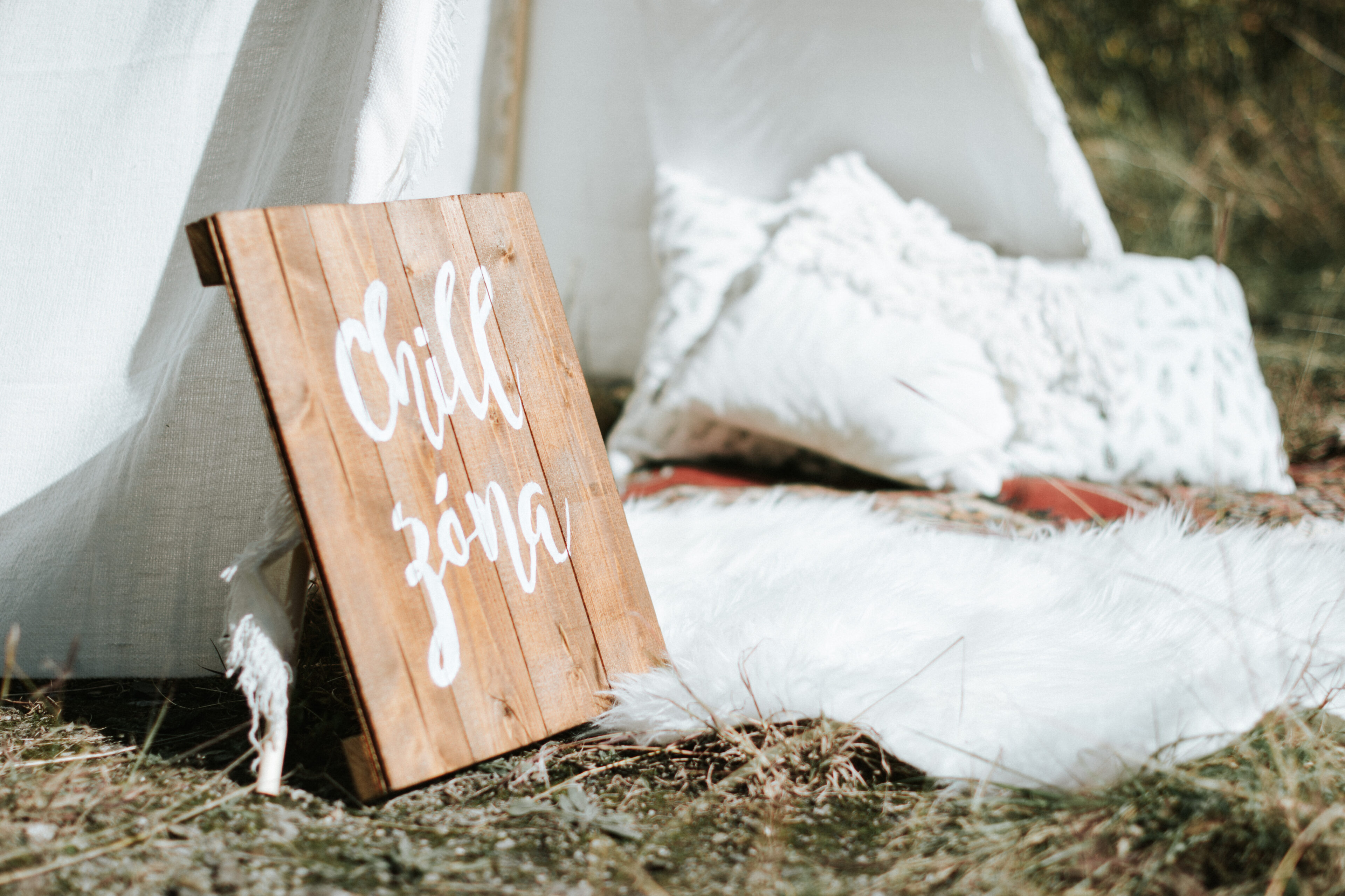 Originální teepee s ručně vyráběnou macramé dekorací vytvoří dokonalý koutek pro odpočinek během Vašeho svatebního dne. Je nejen příjemné pro relax, ale bude vypadat perfektně na všech svatebních fotografiích a videu! Dokonalý prvek, který učiní Vaši svatbu nezapomenutelnou! Dřevěná tabule s popisem je bezvadným detailem, díky kterému se Vaši hosté jednoduše zorientují v prostoru a nabízených aktivitách.